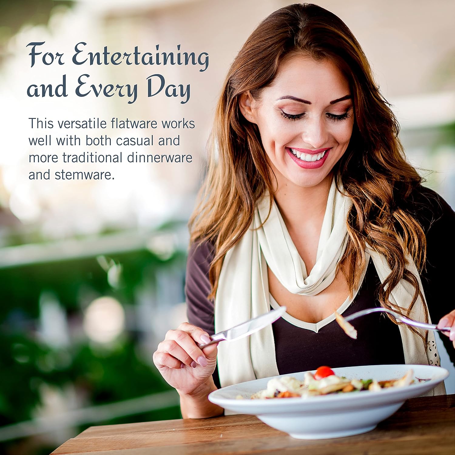 In addition to the 12 dinner forks, salad forks, dinner knives, dinner spoons, and teaspoons, this set also includes essential serving utensils, including a serving spoon, slotted serving spoon, serving fork, butter knife, and sugar spoon.