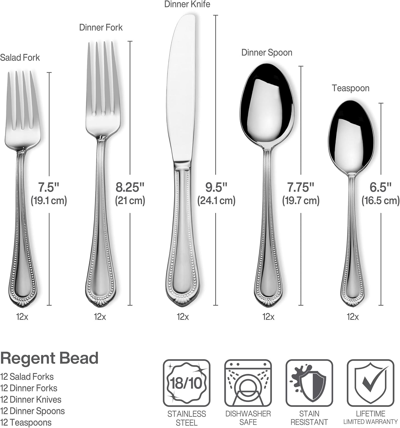 Introducing the Mikasa Regent Bead Flatware Service for 12, a stunning 65-piece set crafted from premium 18/10 stainless steel. Elevate your dining experience with this elegant silverware set that combines timeless design with exceptional quality.